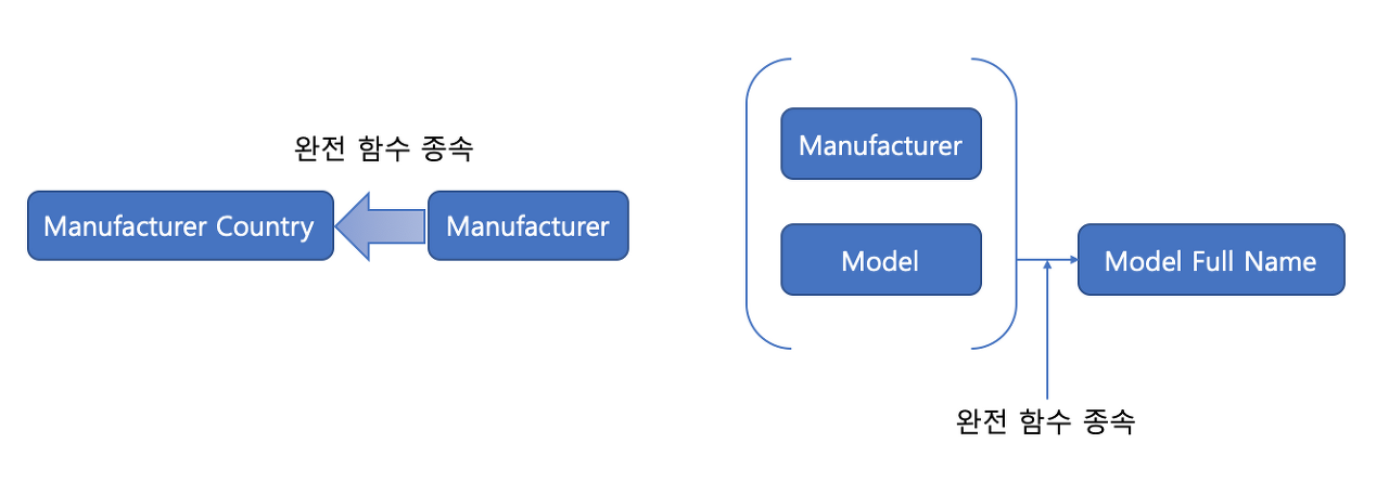 위에서 Model과 Manufacturer를 알면 Model Full Name 필드를 아예 유지하지 않거나 참조하지 않아도 결정되기 때문에, {Model, Manufacturer} -> Model Full Name 이라고 할 수 있다. 하지만 {Model, Manufacturer} -> Manufacturer Country에서 Model과 Manufacturer Country는 아무런 연관 관계가 없기 때문에, Manufacturer Country는 Manufacturer와만 종속관계에 있게 되고 이를 부분 함수 종속이라고 하게 되는 것이다. 아래의 그림을 보면 쉽게 이해할 수 있다.