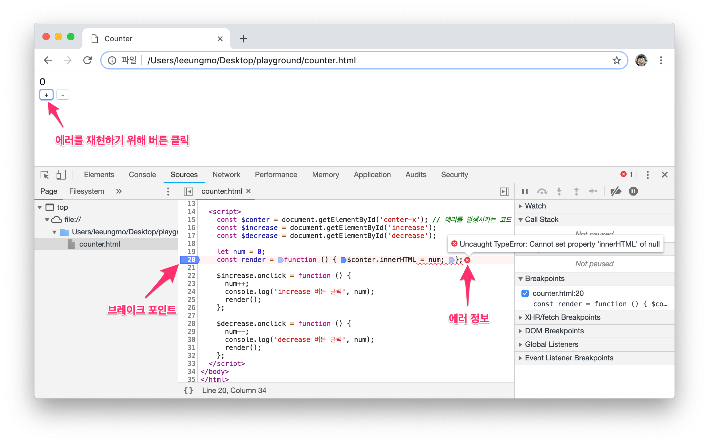에러가 발생한 위치에 빨간 밑줄이 표시되고 그 위에 마우스를 올려 보면 Uncaught TypeError: Cannot set property ‘innerHTML’ of null이라는 에러 정보가 표시된다. 이 에러는 innerHTML 프로퍼티에 값을 할당하기 위해 객체 $conter를 참조했으나 그 객체가 null이기 때문에 발생한 에러다. $conter의 값이 null인지 확인해보고 null이라면 그 이유를 알아내어 에러 발생 원인을 제거해 보자. 에러가 발생한 코드 왼쪽의 라인 번호를 클릭하여 브레이크 포인트(중단점)을 걸고 다시 버튼을 클릭하면 아래와 같이 디버깅 모드로 들어가게 된다.