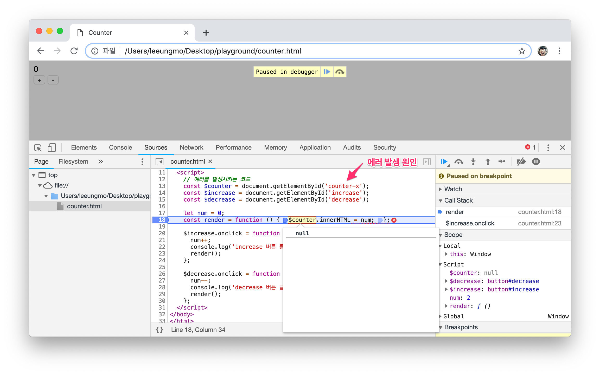 $conter의 값이 null인 것을 확인했다. 그 원인은 13 라인에서 $conter에 값을 할당할 때, HTML 요소의 아이디를 ‘counter-x’로 잘못 지정한 탓이다. 다시 소스코드로 돌아가 HTML 요소의 아이디를 ‘counter’로 정확히 지정하면 에러가 제거될 것이다.