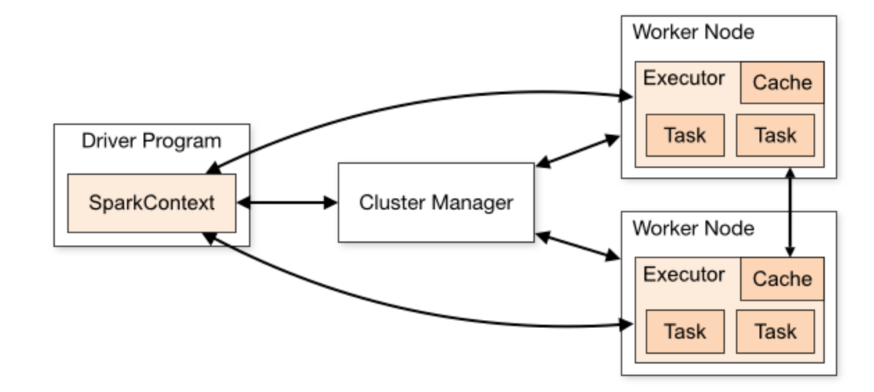 Cluster Manager와 연결되어 SparkContext는 워커 노드에 있는 Excutor에서 잡을 할당하게 됩니다.