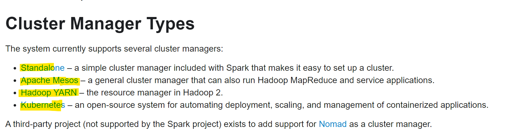 Cluster Manager : 클러스터의 리소스를 관리하고 리소스를 할당받기 위해 사용된다.