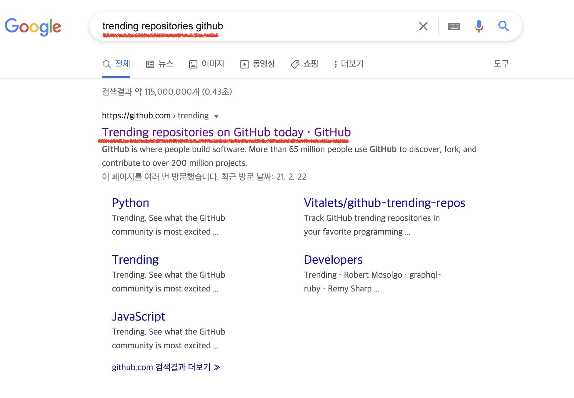 구글에 "trending repositories github" 을 검색해서 github 사이트를 들어가시면 됩니다