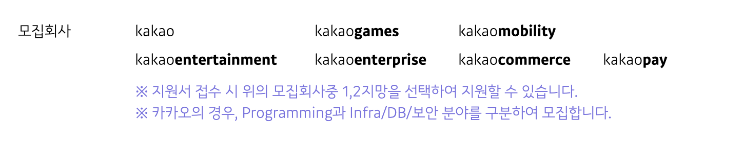 카카오의 경우 Programming, Infra/DB/보안 분야를 나눠서 모집하고 있네요