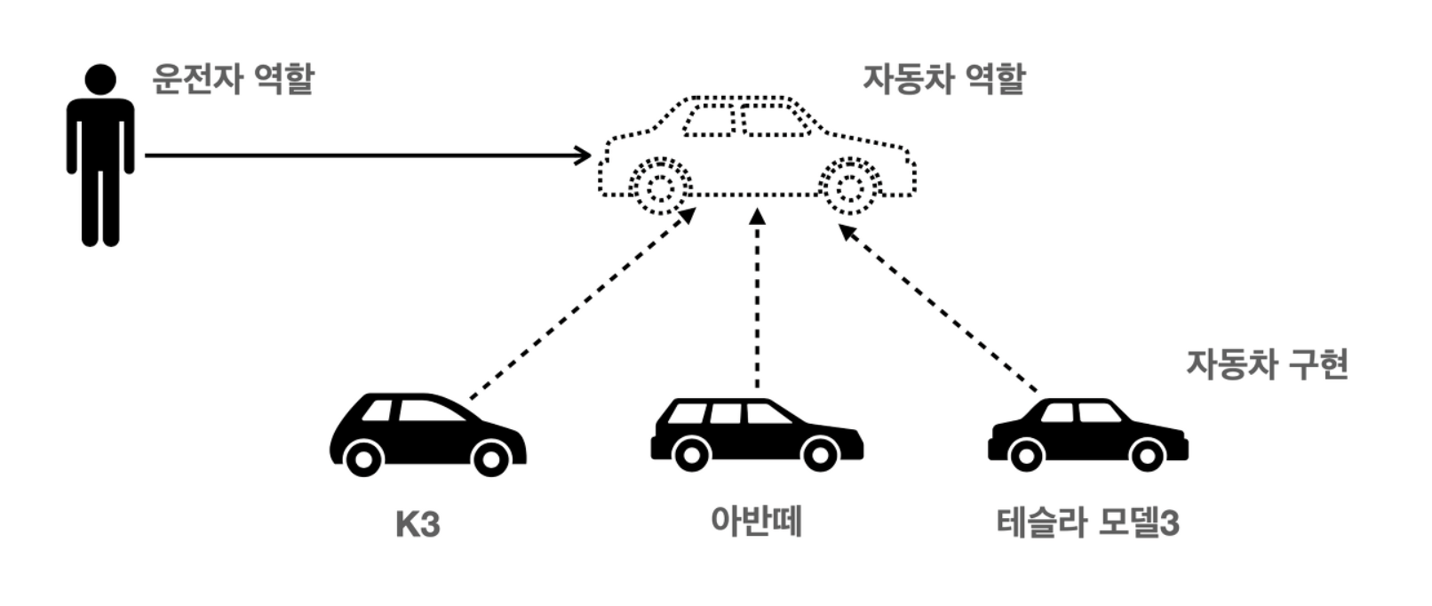 예전에 봤던 예시를 보자. 운전자가 구현 클래스라 할 수 있는 K3에 의존을 하고 있었다고 해보자. K3만 알고, K3에 존재하는 기능들만 운전자는 알고 있는 것이다. 자동차가 테슬라 모델3로 변경되면 어떨까? 실제 세계에서는 기본적으로 운전하는 것은 가능하겠지만, K3만 알고 있다는 가정으로는 테슬라의 기능은 사용할 수 없게 된다고 보면 된다.