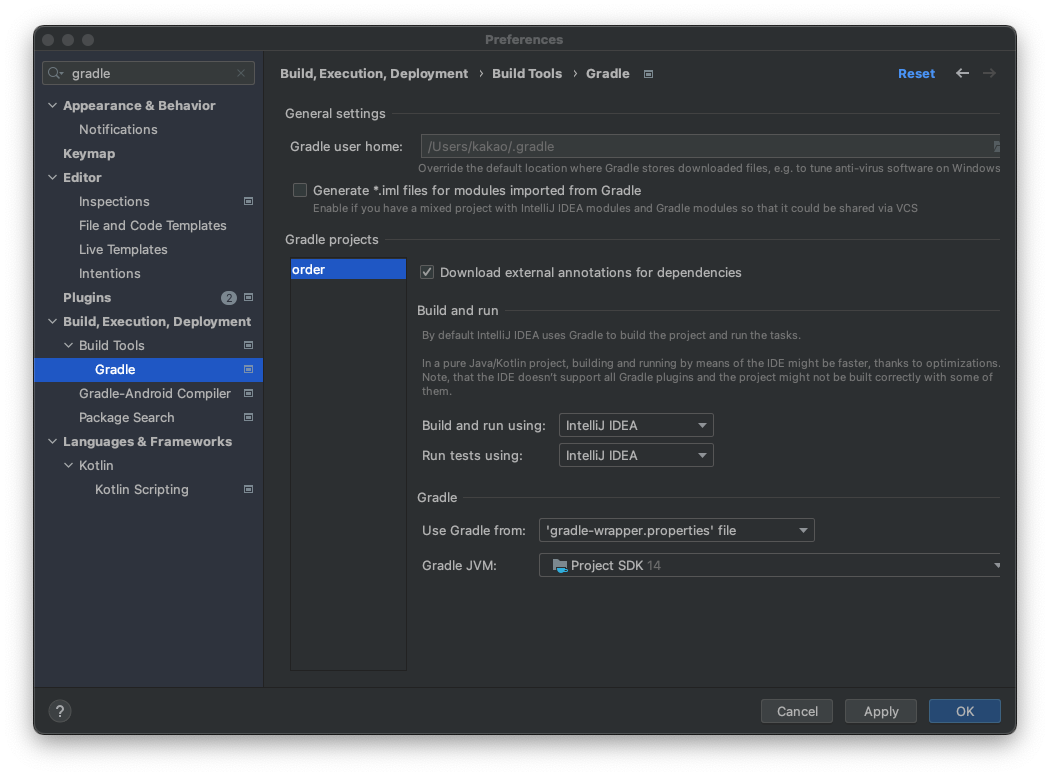 하나 설정을 바꿔주면 좋을 것이 있다. Preferences 에 들어가서 Gradle이라고 검색을 해보자. 이렇게 세팅하는 화면이 나올텐데, 여기서 Build and run using 과 Run tests using을 intellij 로 바꾸도록 하자. 자바에서 바로 실행하기 때문에 실행이 훨씬 빠르다.