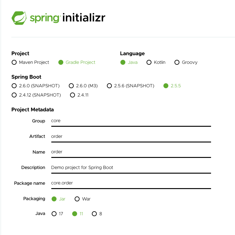 언어는 자바를 선택하도록 한다. 다른 언어는 사용해본적은 없는데 스프링에서도 기본적으로 제공을 하는 것 같다. 스프링 부트의 버전은 이미 선택이 되어 있는데, 2.5.5 버전이 현재로는 가장 안정적인 버전인 듯 하다.