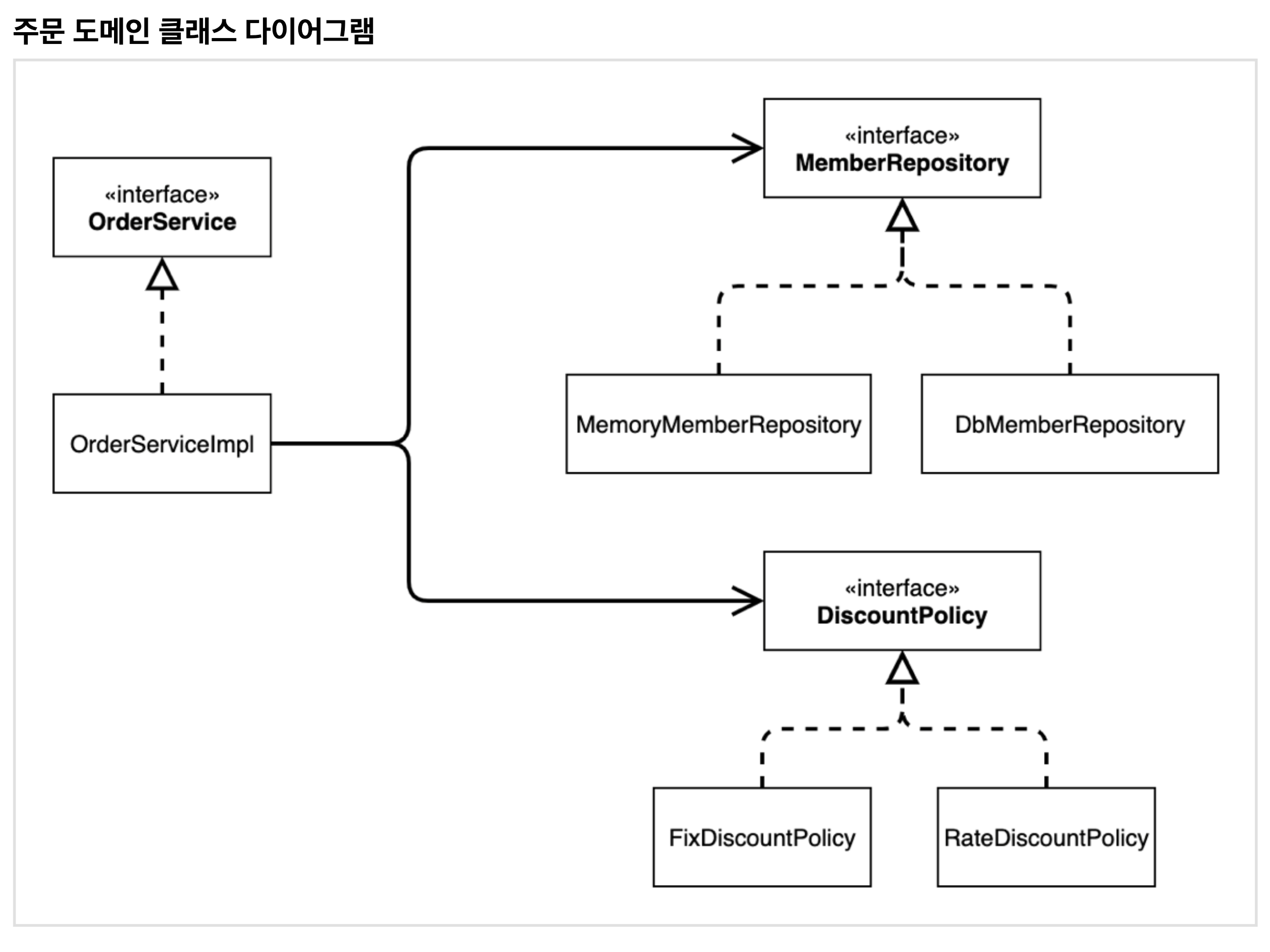 구현체를 다르게 변경을 할 수 있다. 메모리가 아니라 DB 회원 저장소를 사용할 수 있고, 정액이 아닌 정률 할인 정책으로도 사용할 수 있다. 하지만 전혀 협력관계는 변경되지 않는 것을 볼 수 있다.