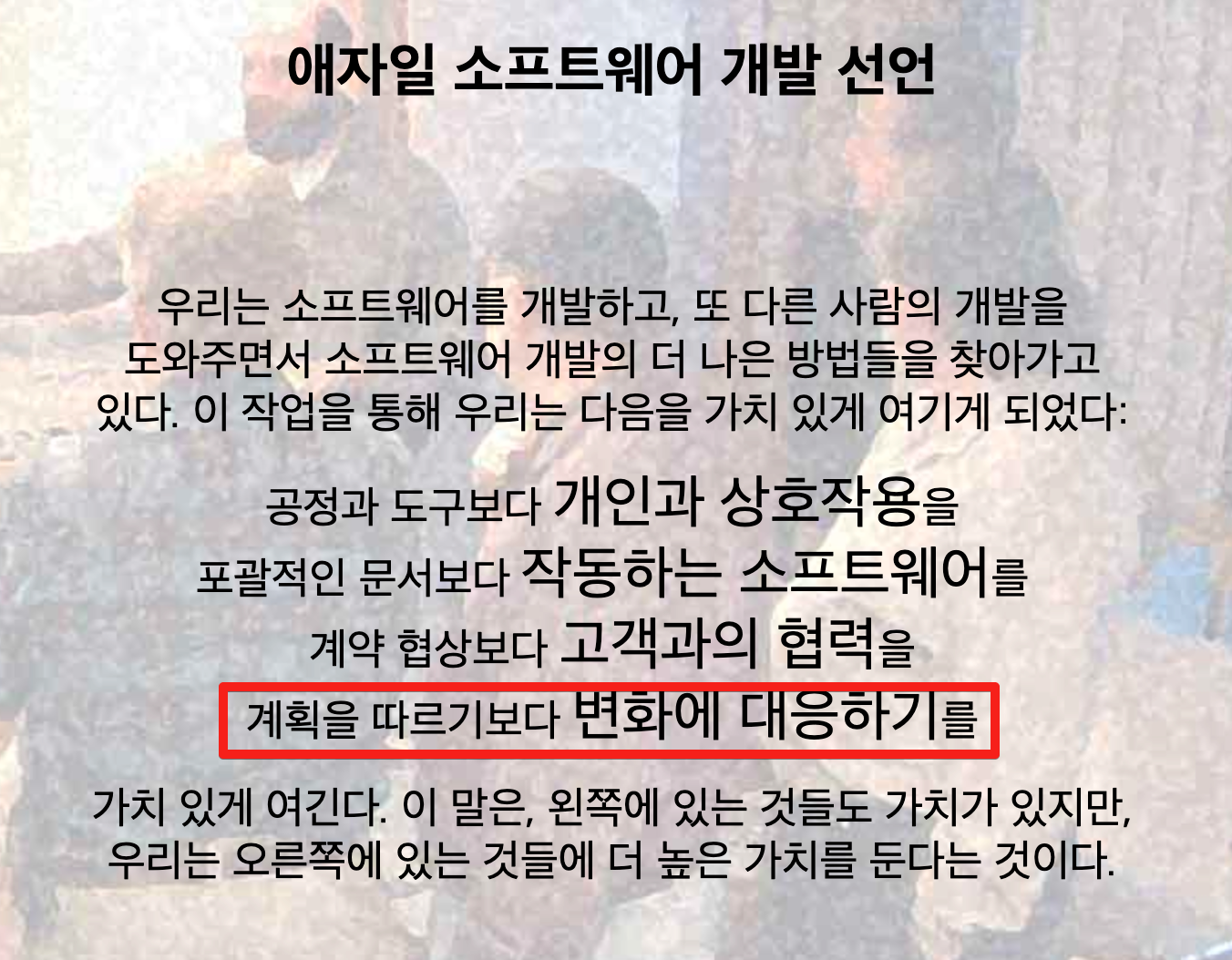 기획자는 애자일 소프트웨어 개발 선언에 따라서 계획을 따르기보다는 변화에 대응하라는 말을 한다. 열받는 말이지만 우리도 이 말에 맞게 대응을 해볼 수 있도로 한다.