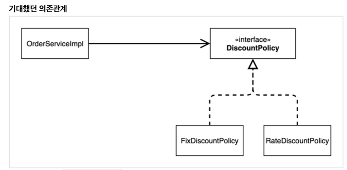 DIP 원칙을 다시 기억해보자. "추상화에 의존해야지, 구체화에 의존하면 안된다" 라는 원칙이다. 구현 클래스에 의존하지 말고 인터페이스에 의존하라는 뜻이다. 여기서 OrderServiceImpl 은 DiscountPolicy를 의존하고 있으니 추상화에 의존하고 있다고 할 수 있을까?