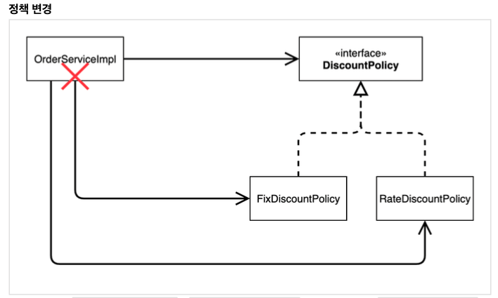 실제로는 인터페이스와 구현 클래스 모두를 의존하고 있는 모습이라는 것을 알 수 있다. 그리고 정책을 변경하면 어떻게 될까?