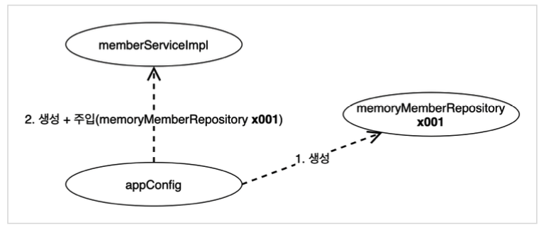 AppConfig는 memoryMemberRepoistory를 생성해서, 참조값을 MemberServiceImpl를 생성하면서 생성자에 전달한다.