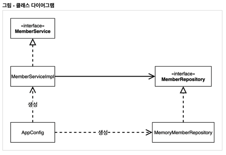 결국 MemberServiceImpl 은 의존관계에 대한 고민은 외부에 맡기고 본인의 역할인 실행에만 집중할 수 있게 되었다.