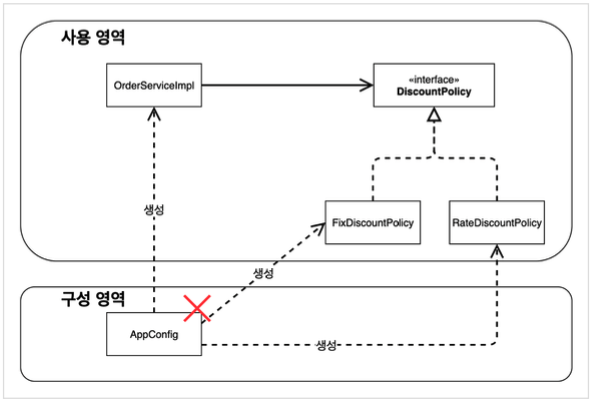 FixDiscountPolicy -> RateDiscountPolicy 로 변경을 하게 되는데 이제 어떤 부분을 바꿔주면 되는지 살펴보자. 우리는 AppConfig를 만들게 되면서 애플리케이션이 실제 로직이 수행되는 사용 영역과 객체를 생성하고 구성(Configuration)하는 영역으로 분리되었다.