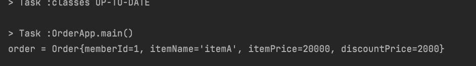 구성을 담당하는 AppConfig에서 DiscountPolicy를 RateDiscountPolicy로 수정해주기만 하면 된다. 실제로 메인 메소드를 수행해보면서 결과가 정상적으로 나오는지 까지 확인해보자.