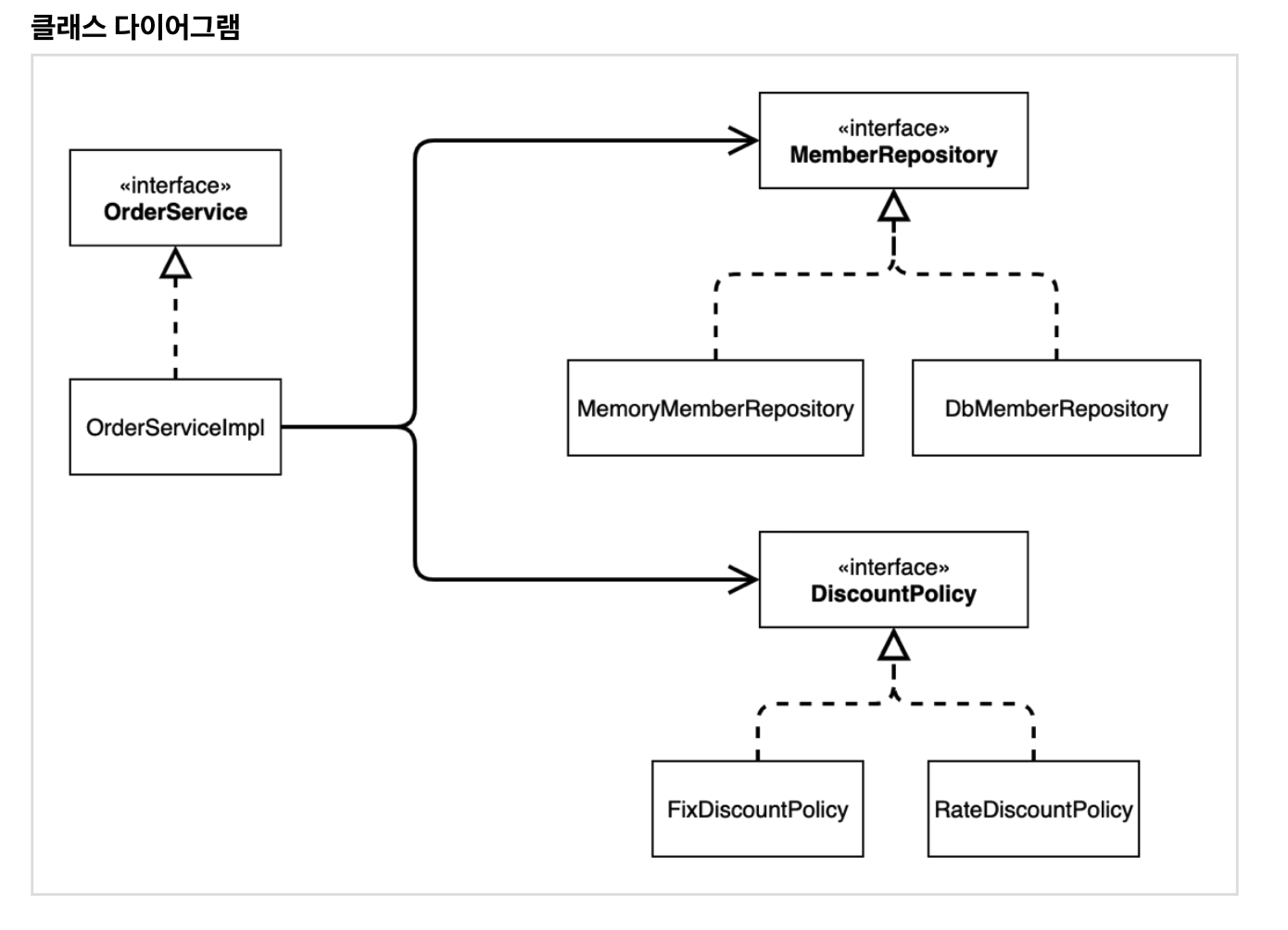 이 클래스 다이어그램을 보면 OrderServiceImpl 은 MemberRepository와 DiscountPolicy에 의존한다는 것을 알 수 있다. 하지만 실제 어떤 구현 객체가 주입될지는 이것을 통해서는 알 수 없다.