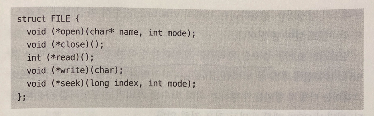 이런 다형성을 통해서, 새로운 입출력 장치가 추가될 때 어떤 장점이 있는지를 생각해보자. 새로운 입출력 드라이버가 FILE에 정의된 표준 함수를 구현한다면 복사 프로그램은 전혀 변경될 것이 없다. 장치에 의존적이지 않은 장치 독립적이고, 뺐다 갈아끼웠다 할 수 있는 플러그인 아키텍쳐인 것이다.
