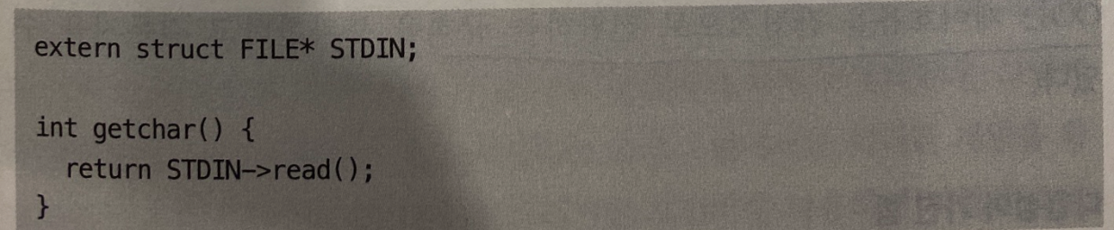 이렇게 해서 STDIN을 FILE* 로 선언하면, 내부에 있는 5가지 함수를 사용하는데, 이는 실제 입출력에 맞는 구현이 되는 것이다. getchar 메소드의 경우 STDIN 으로 참조되는 FILE 구조의 read 포인가 가리키는 함수를 호출하는 것이다.
