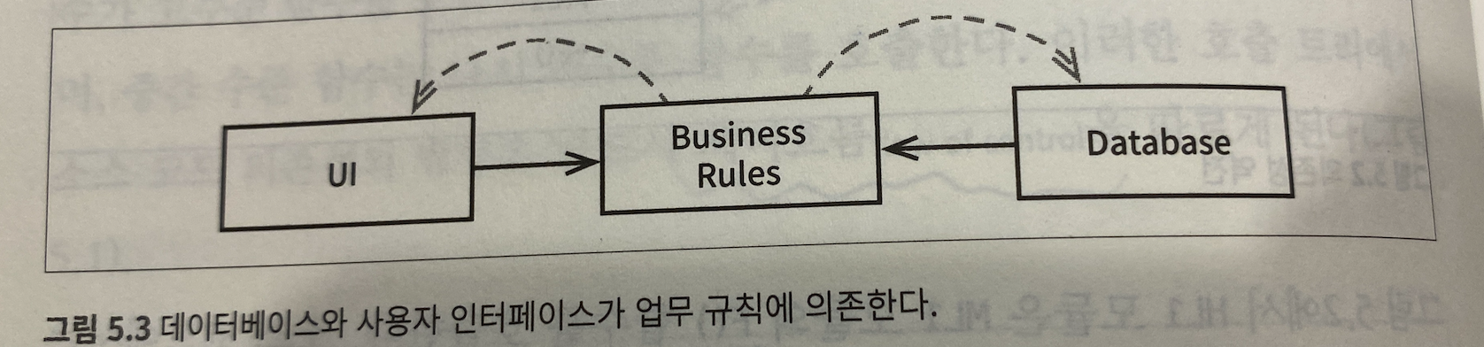 의존성이 역전을 예시를 들어서 보변, 업무 규칙이 UI와 Database에 의존을 했다 ( 코드를 알고, 직접 관리&사용했다 )고 생각을 해봅시다. 그러면 UI의 소스가 비뀌면 업무 규칙 내에서도 같이 변경을 해줘야하는 일이 생겼습니다.