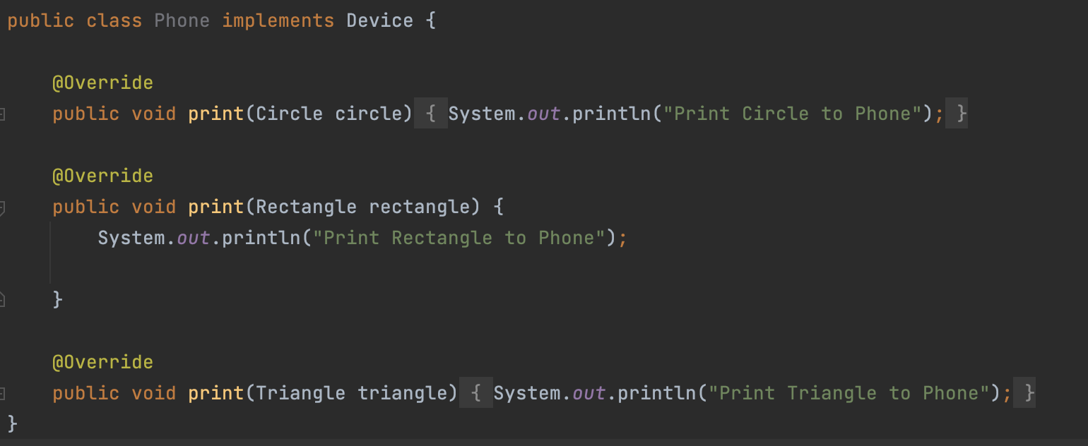 그리고 구현체에서는 device 의 비지터메소드 ( 여기서는 print ) 에 자기 자신을 넣어주게 된다. 이 의미는 내 정보를 넣어줄테니 너가 알아서 처리해라. 라고 볼 수 있다.