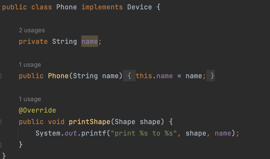 그리고 구현체에서는 device 의 비지터메소드 ( 여기서는 print ) 에 자기 자신을 넣어주게 된다. 이 의미는 내 정보를 넣어줄테니 너가 알아서 처리해라. 라고 볼 수 있다.