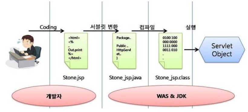 서블릿은 자바 소스코드 속에 HTML코드가 들어가는 형태인데, JSP는 이와 반대로 HTML 소스코드 속에 자바 소스코드가 들어가는 구조를 갖는 웹어플리케이션 프로그래밍 기술입니다. HTML속에서 자바코드는 <% 소스코드 %> 또는 <%= 소스코드 =%>형태로 들어갑니다. 자바 소스코드로 작성된 이 부분은 웹 브라우저로 보내는 것이아니라 웹 서버에서 실행되는 부분입니다. 웹 프로그래머가 소스코드를 수정 할 경우에도 디자인 부분을 제외하고 자바 소스코드만 수정하면 되기에 효율을 높여줍니다. 또한 컴파일과 같은 과정을 할 필요없이 JSP페이지를 작성하여웹 서버의 디렉토리에 추가만 하면 사용이 가능합니다. 서블릿 규칙은 꽤나 복집하기 때문에 JSP가 나오게 되었는데 JSP는 WAS(Web Application Server)에 의하여 서블릿 클래스로 변환하여 사용되어 집니다.