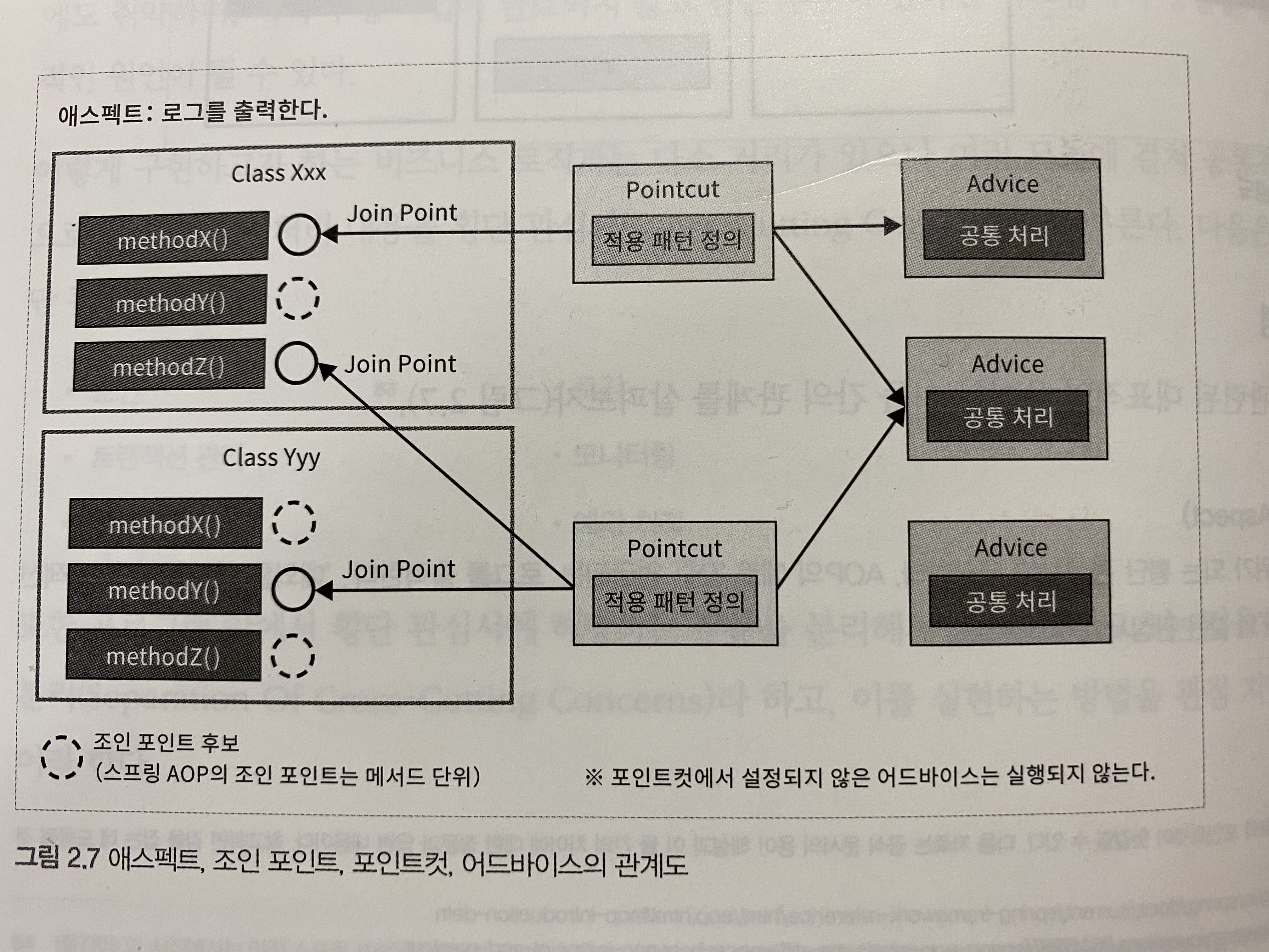 - 애스팩트 : 단위되는 횡단 관심사. 예로 "로그를 출력한다", "트랜잭션을 관리한다"와 같은 관심사가 애스팩트이다.