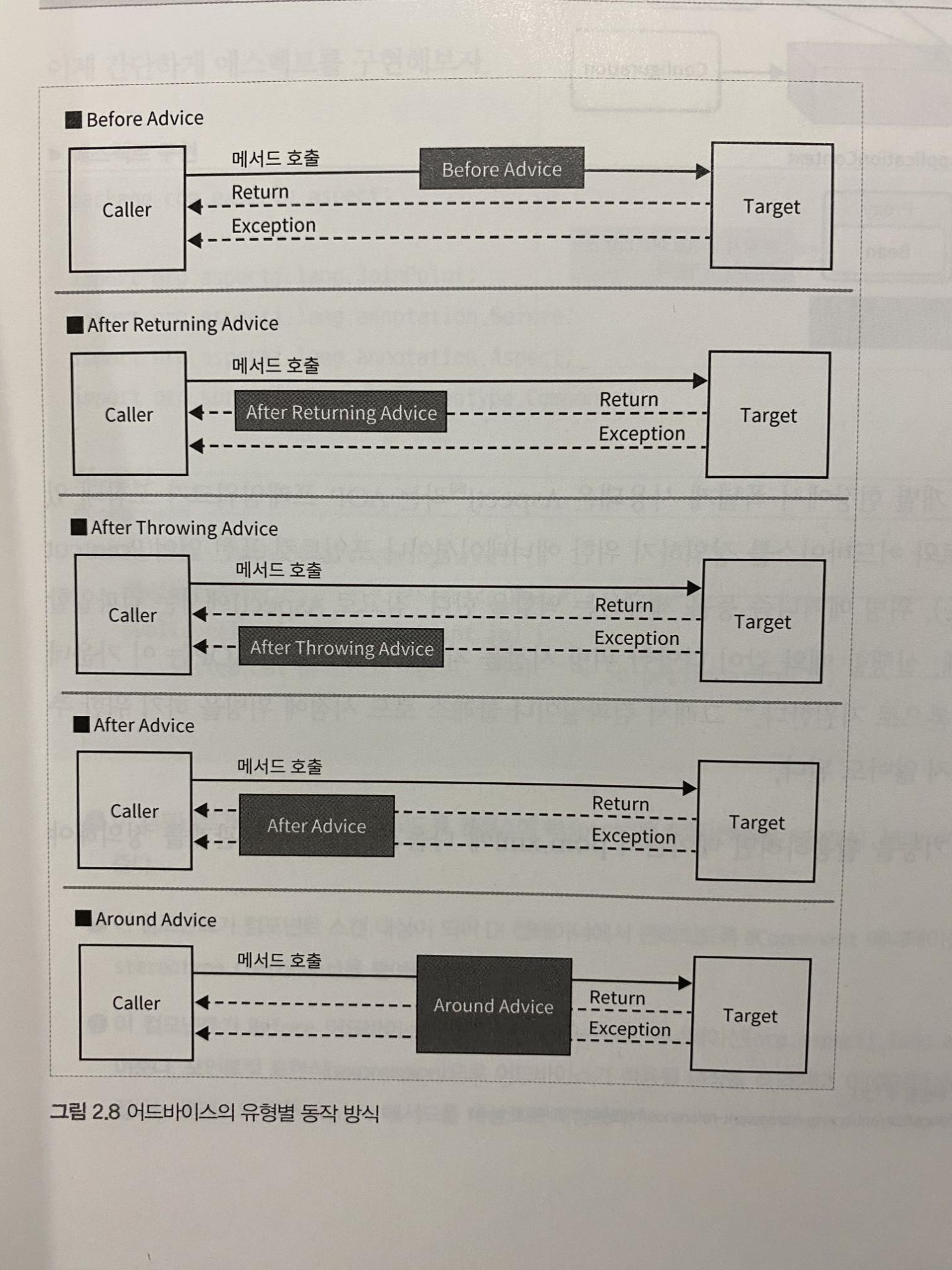 - 위빙 : 애플리케이션 코드의 적절한 시점에 애스팩트를 적용하는 것. 라이브러리에 따라 다르고, 컴파일이나 클래스 로딩 등 다양한 시점이 있다. 스프링은 기본적으로 실행 시점이다.