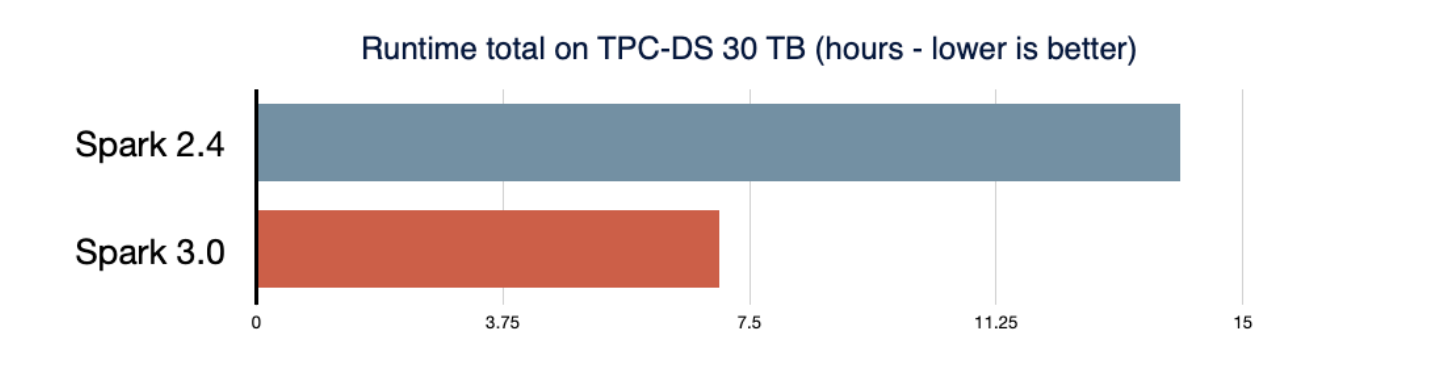 기존 Spark 2.4 버전과 Spark 3.0 버전을 비교했을때, TPC-DS 30TB 기준 아래와 같은 성능차이를 보여주고 있다.