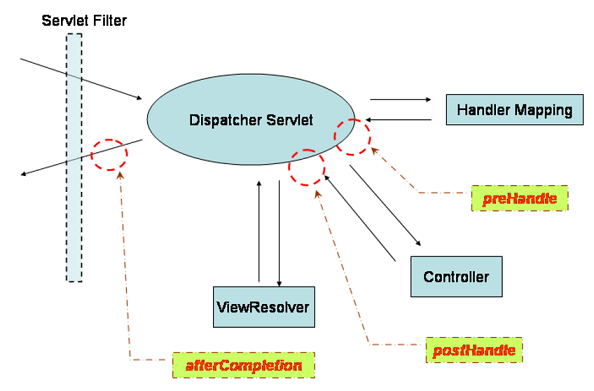 -Spring에서 실행될 컨트롤러 빈 오브젝트, 컨트롤러가 돌려주는 ModelAndView, 발생한 예외 등을 제공받을수 있음.
