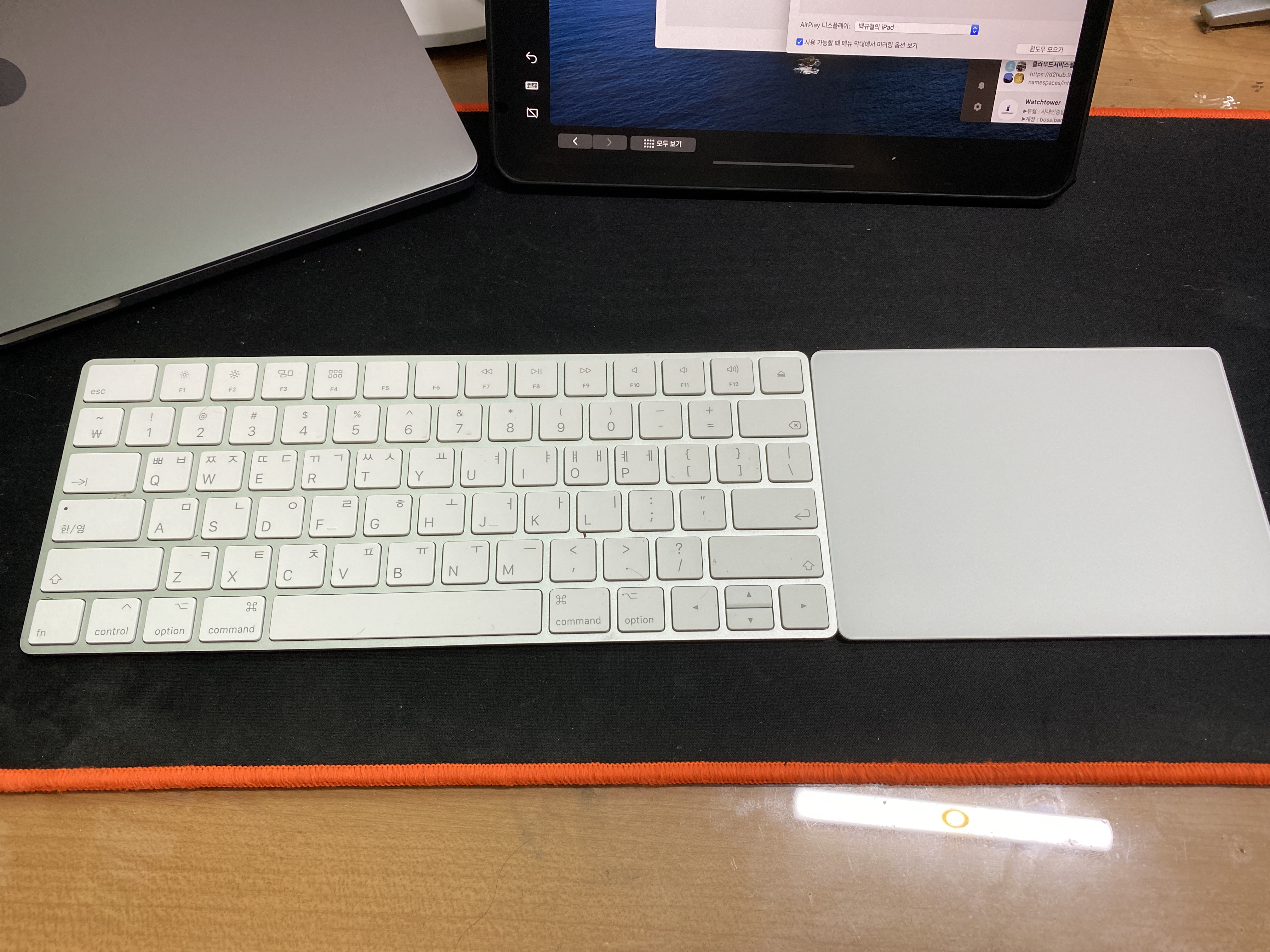 매직트랙패드 까지 왔으니, 재택근무 환경을 제대로 세팅해보았다. 아이패드는 미러링으로 화면을 하나 더 추가하는 식으로 사용하고 있다. 확실히 트랙패드를 쓰니, 기존 맥북에서 쓰던 제스처를 편하게 쓸 수 있어서 업무 효율이 훨씬 올라가는 것 같다.
