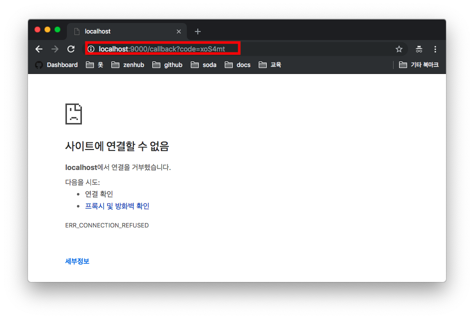 권한 승인이 완료하면 권한 코드가 전송됩니다. Authorization Code Grant Type 방식 에서 말한 권한 부여 코드를 응답받은 것입니다.