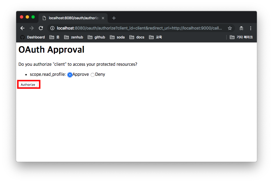 유저 정보 인증이 완료되면 scope에 대한 권한 승인이 페이지가 나옵니다. 소셜 가입에서 프로필 정보, 프로필 사진 등을 요구하는 것과 마찬가지입니다.